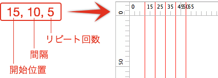 垂直ガイドラインをリピートして作成します。値は、開始位置(Y座標), 間隔, リピート回数の順番で入力します。