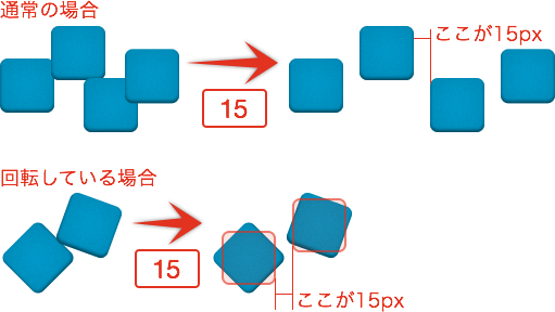 選択しているオブジェクト中で一番下にあるレイヤーを基準に、オブジェクトを入力した数値分の間隔を空けて垂直方向に再配置します。オブジェクトを回転している場合は、回転していない状態と見なして再配置されます(角度を0に戻すと入力した値分の間隔が空いている)。水平方向は変化しません。