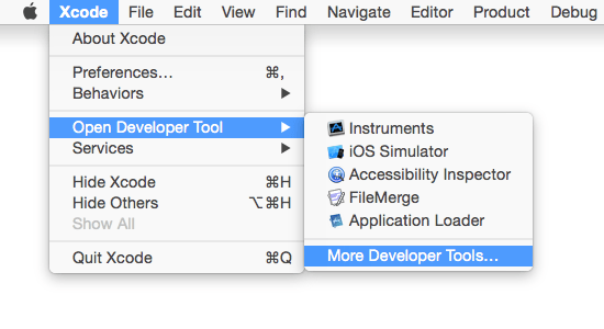 ちなみに、Xcodeで[Xcode]メニューから[Open Developer Tools]→[More Developer Tools…]からも、ダウンロードセンターへアクセスできます。