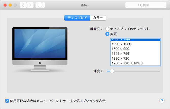 元に戻すには、同じく環境設定のディスプレイからiMac向けの解像度を選択します。