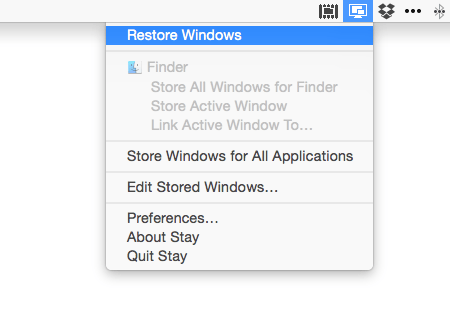使い方は簡単です。Stayを起動すると右上にディスプレイっぽいアイコンが表示されるので、その中から「Store Windows for All Applications」を選択してウィンドウの配置を記録しておきます。