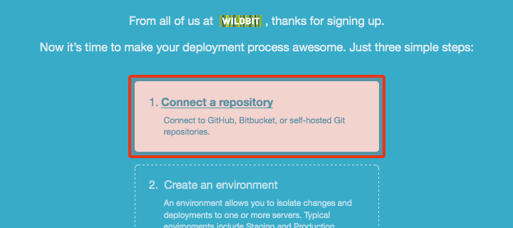 Dashboardへアクセスし、ハイライトされている「Connetct a repository」クリックします。
