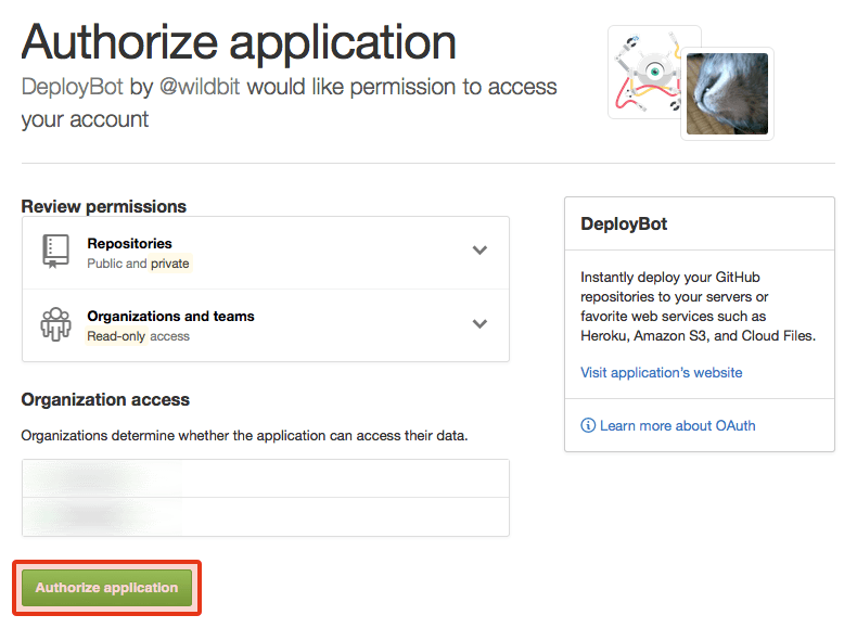 GitHubのAuthorize applicationというタイトルで、DeployBotのアクセスを許可するかどうか認証が入りますので、内容を確認して認証してください。