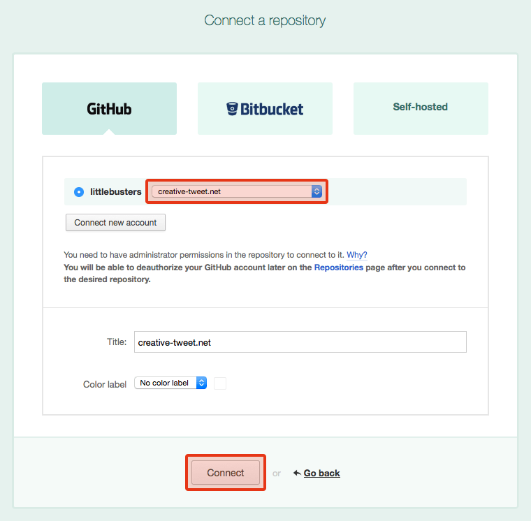 認証すると元の画面に戻りますので、プルダウンメニューからプル対象のリポジトリを選択します。下のTitle:へリポジトリ名が入力されるので、必要に応じて修正してください。