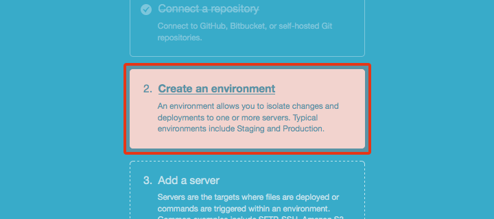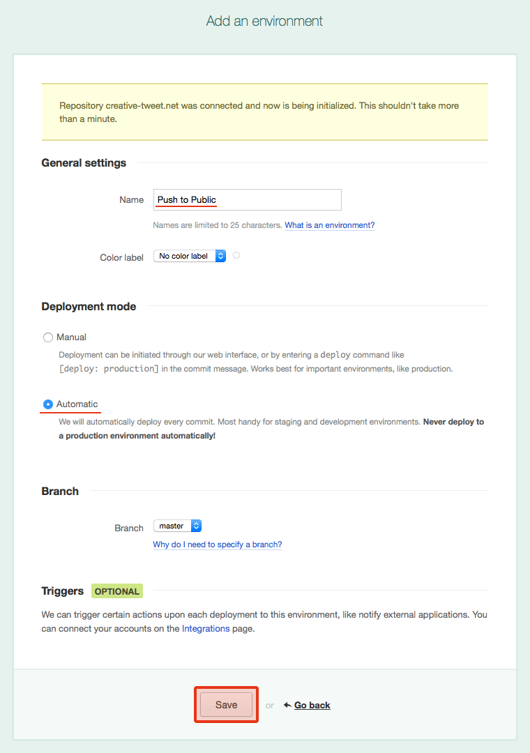 他にもオプションを指定できますが、今回は使用しません(例えば「Trigger a webhook after deployment is done」を設定すれば、デプロイが完了したらSlackやGlipなどへポストすることもできます)。