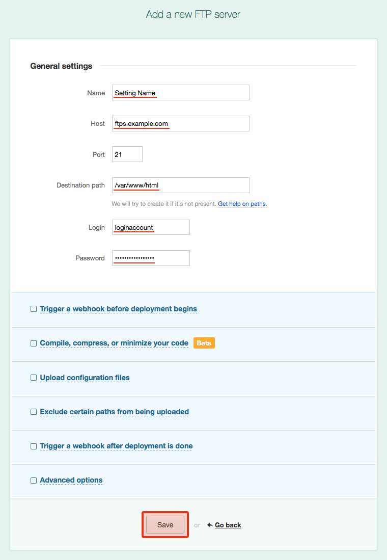 Destination pathでは、デプロイするディレクトリを指定します。一般的には公開ディレクトリへのパスを指定します。
