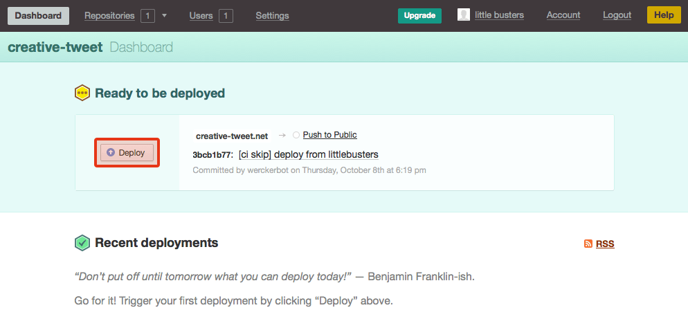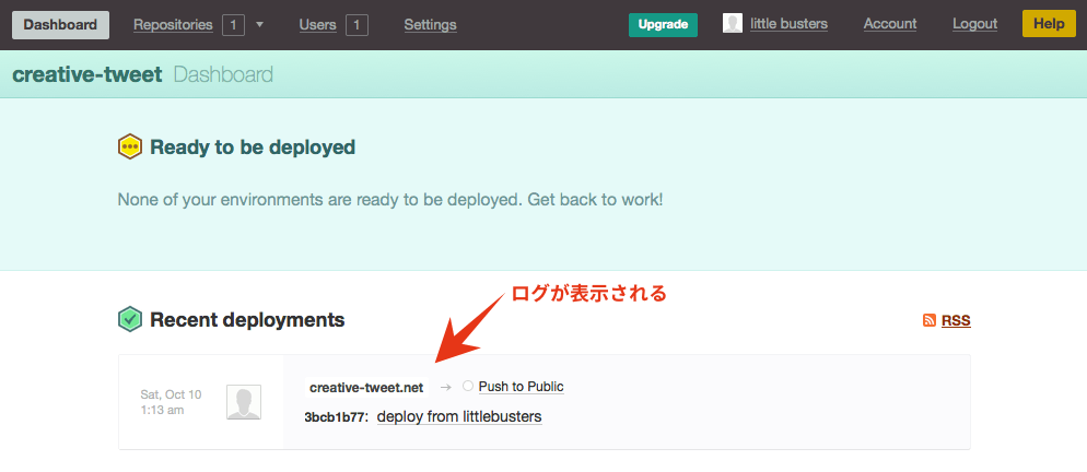 「Ready to be deployed」のタイトルとともに[Deploy]ボタンが表示されていると思いますので、ボタンをクリックします。
