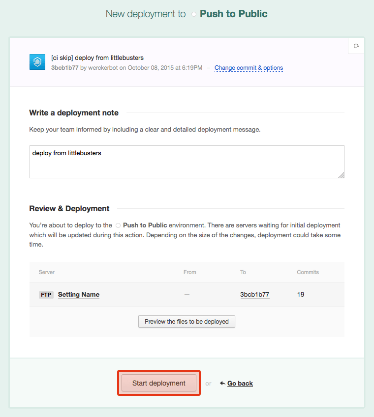 続いて、デプロイのメモをつけたりやプレビューできたりといった画面に切り替わります。下の[Start deployment]ボタンをクリックすればデプロイ(アップロード)が始まります。