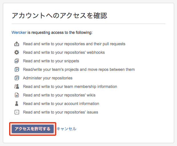 Bitbucketの認証画面が出てくると思いますので、内容を確認して[アクセスを許可する]ボタンをクリックします。