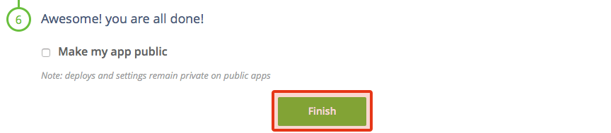 Awesome! you are all done!では、「Make my app public」のチェックを外した状態で[Finish]ボタンをクリックします。