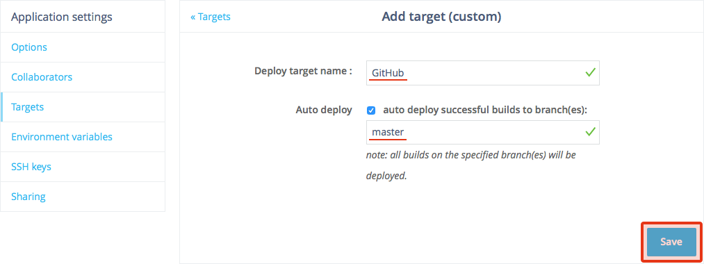 Deploy target nameは、ターゲットの名前ですので、任意に設定します。Auto deployは、ビルドが成功すれば自動的にプッシュするオプションです。今回は、ウェブサイトのデプロイですし自動化をすることが主たる目的ですのでチェックを入れます。その下のテキストエリアには、ブランチ名を入力します。基本的にmasterブランチへプシュするので「master」と入力し[Save]ボタンをクリックします。