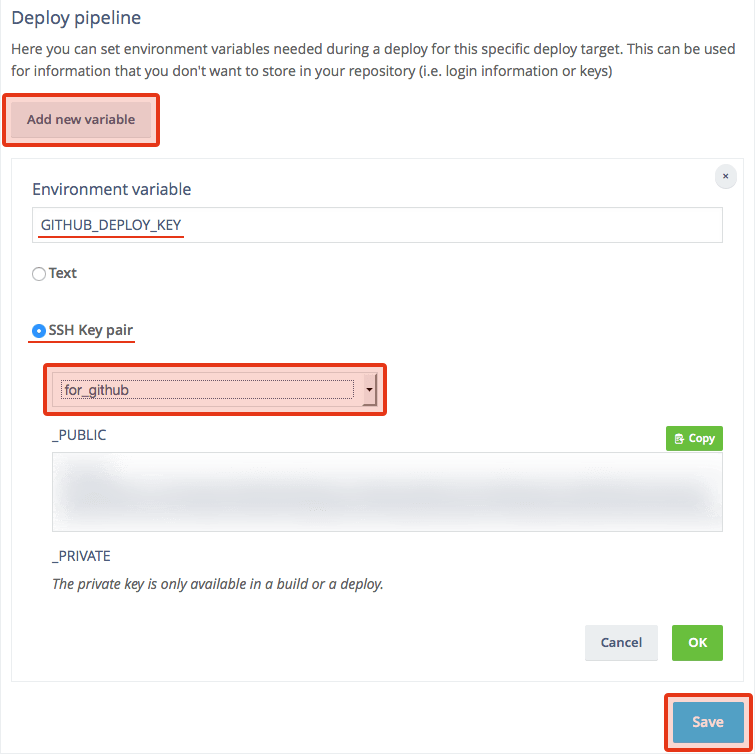 Environment variableへは変数名を入力します。今回は「GITHUB_DEPLOY_KEY」としました。