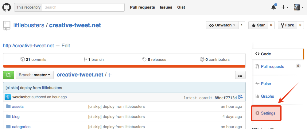 GitHubへアクセスし、該当のリポジトリへアクセスします。右にあるSettingsメニューへアクセスします。