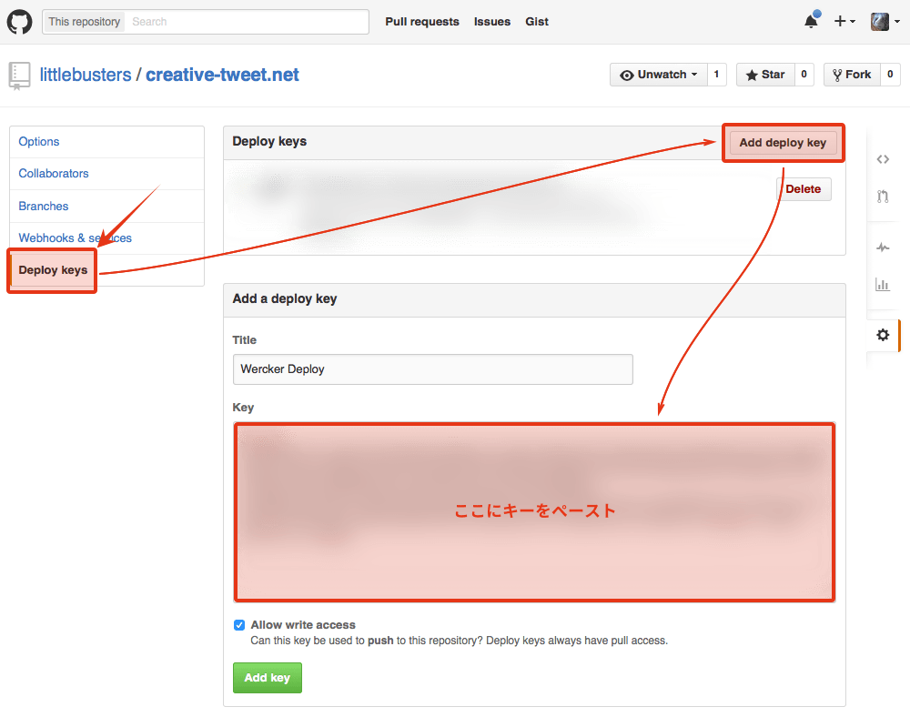 [Add deploy key]ボタンをクリックし、Titleへ適当な名前を、Keyへ先ほどコピーした内容をペーストし、書き込めるように「Allow write access」にチェックを入れて[Add key]ボタンをクリックします。