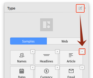 Samplesタブには、デフォルトでは9種のダミーが用意されており、テキストレイヤーを選択した状態(複数レイヤー可)でブロックをクリックすれば、そのデータを挿入できます。
