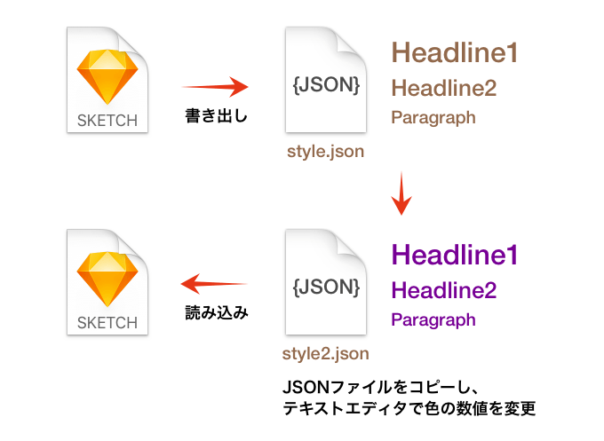 3日目に紹介したSketch Paletteもそうですが、中間フォーマットで外部に保存しておけば共有も簡単ですし、Sketchがなくても情報がわかるため、例えばJavaScriptを使ってJSONをパースしCSSへ書き出す、といったこともできます。中間フォーマット、バンザイ!