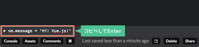 >の表示に続きvm.message = 'Hi! Vue.js!'←をコピペしEnterキーで実行してみましょう(Hi! Vue.js!は適当に変えOKです)。