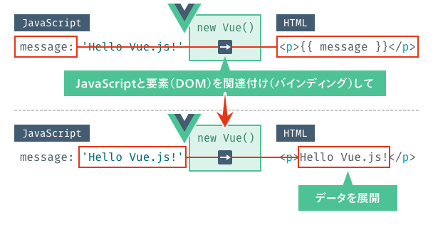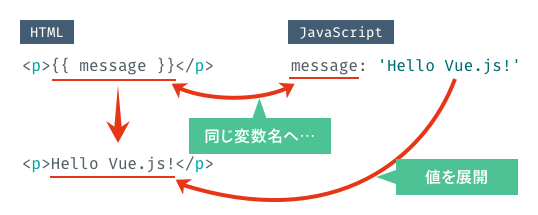 仕組みとしては、Vueがインスタンス化するときに、JavaScript側の変数とHTML側の{{}}を関連付け(バインディング)します。