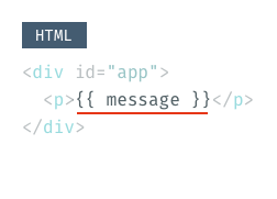 p要素にある{{ message }}は、JavaScript側のデータを流し込むための「枠」を設定しています。{{}}は最も基本的なテンプレート構文で、JavaScript側で設定された値を{{}}部分へ展開します。