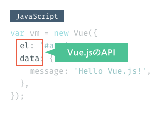 ここまで解説したelやdataは、Vue.jsのAPIと呼ばれるもので、Vue.jsを扱う上での規格のようなものです。用意されているAPIを使って、さまざまな処理を記述します。