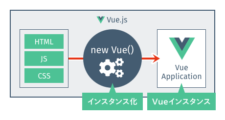 これは、HTMLやJavaScriptで記述した設定を元に、Vue.jsが実際に動くアプリケーションに処理して起動する「合図のようなもの」と考えてください。この処理を「インスタンス化」といい、処理して作成されたものを「Vueインスタンス」といいます。