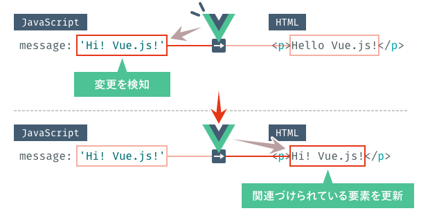 コンソールで実行したコードは、dataにあるmessageの値の書き換えを行うものでした。Vue.jsでは、このようにJavaScriptの値が書き変わると関連するHTMLの表示の書き換えを行います。