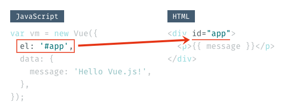 elは、HTML側でVue.jsを展開する場所(id)を指定します。idを表す#を忘れずに。