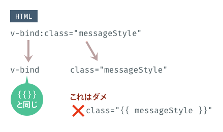 このv-bindは、1つ前に説明した{{}}と同じで、class属性の値をmessageStyleでバインディングする処理です。前の解説からするとclass="{{ messageStyle }}"と書きたいところですが、実は{{}}で書けるのはHTMLの要素内に限られるため、属性値をバインディングしたい場合はv-bindを使います。