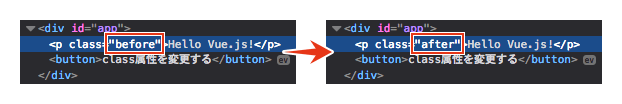 button要素には、見慣れない属性のv-on:click="changeClass()"が設定されています。