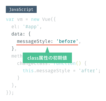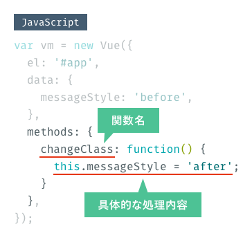 function()に続く{}で括られている部分が具体的な処理内容です。今回はafterクラスを適用するため、this.messageStyle = 'after';としています。