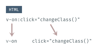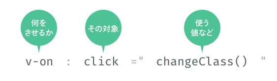 v-onは、ユーザの操作(イベント)を検知するもので、今回はclickと組み合わせているので、クリックイベントを監視します。設定した要素にクリックイベントが発生したら、値として設定しているchangeClass()が実行されます。