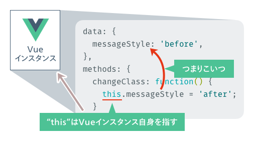 messageStyleにthisが付いていますが、methods中でVueインスタンスの関数や変数を使うときは、thisをつける必要があります。このthisはVueインスタンス自身を指しており、つまりは自分の中の関数や変数を使いますよ、ということを明示しているような感じです。