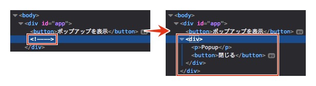 このコードを実行しブラウザのDevToolで見ると、v-ifを設定した要素がないことが確認できます。「ポップアップを表示」ボタンを押すと要素が生成され、さらに「閉じる」ボタンを押すと要素が削除されます。