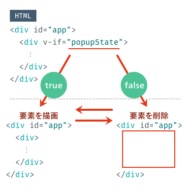 ポップアップのdiv要素にはv-ifを設定しています。このv-ifはpopupStateの値を確認し、trueであればこのdiv要素を描画、falseであれば描画そのものがされません。