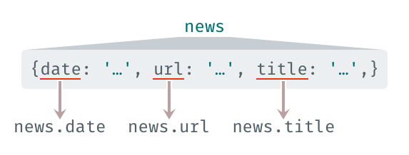 入ったデータの構成がObject(key: velueという形式)の場合、news.keyという形式で、ドット区切りで中のデータにアクセスできます。