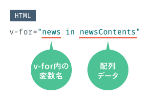 v-forは、その属性で『「v-for内で使う変数名」in「配列データ」』という形で繰り返しを指定します。