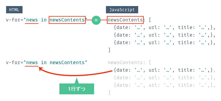 v-forの処理が始まると、1回の処理後ごとにnewsの中へnewsContentsのデータが1行ずつ(今回の場合{}の単位)入ります。