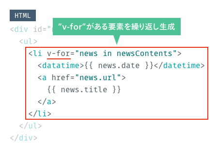 今回の例では、v-forが設定されているli要素が繰り返し生成されます。datetime要素で日付を、a要素にタイトルとそのリンク先が設定されます。