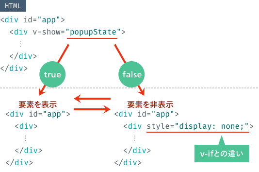 条件にマッチした場合、要素を表示するディレクティブです。v-ifと似ていますが、こちらは要素のstyle属性でdisplay: none;の付加および除去を行います。ブラウザ上での表示結果は同じですが、非表示時にHTML上へ要素が存在するか否かが異なります。