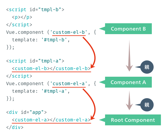 Componentの親子関係は、カスタム要素をどのComponentで使ったかで決まります。今回の場合、list-item要素はVueインスタンスが展開する場所に直接使っているため、Vueインスタンス=Root Componentが親になります。カスタム要素をテンプレート内で使えば、そのテンプレートを使ったComponentが親です。