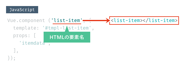 Vue.componetでは、まずHTMLで使うためのカスタム要素の名前を指定します。HTML側でも出てきましたが、list-itemという名前にしています。