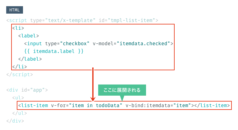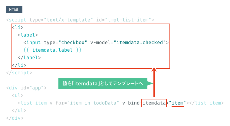今回の例では、todoDataの値を渡す必要がありますが、todoDataはv-forで処理されるため、1行ずつのデータがv-forないの変数itemへ値が入り、itemdataとしてカスタム要素の中へ送られます。