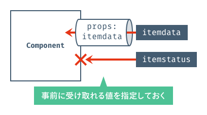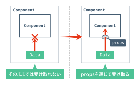 Componentはその単体で自己完結しており、データを外から自由に受け取ることができません。そこでpropsを使いComponentに「穴」を開けることで、親からのデータを受け取ることができるようになります。