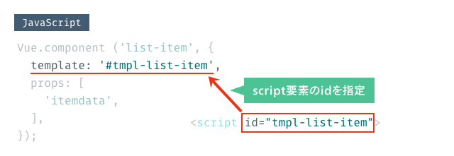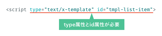 ただし、type属性にはVue.jsのテンプレートを表すtext/x-templateの指定と、JavaScript側からテンプレートを指定するために使うid属性を設定します。