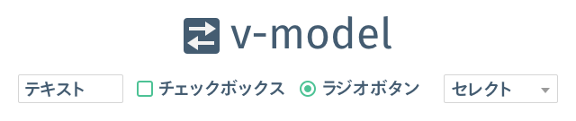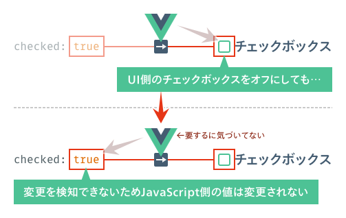 JavaScript側の値が変更された場合に、UI側の値も変わるのはv-bindと同じです。しかし、v-bindではUI側の変更を検知できないため、UIのオン・オフを切り替えても、その変更はJavaScript側へ反映されません。