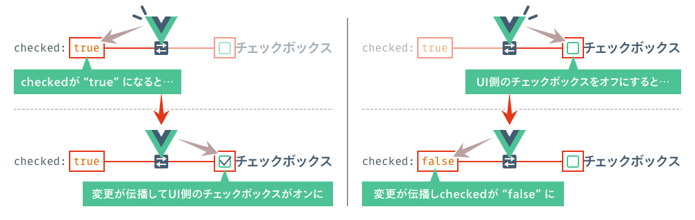 「双方向」の名の通り、データと要素間で値を同期します。ユーザーがチェックボックスのオン・オフを切り替えた場合もdata内の値を変更し、data内の値を変更した場合でも、チェックボックスのオン・オフが切り替わります。