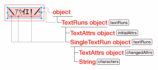 SingleTextRun objectにはTextAttrs objectとStringが格納されており、個別のテキストプロパティがTextAttrs object、それに対応する文字列がStringになります。実際にはもっとプロパティがあるのですが、画像にある「\アウイエ!/」を簡略化した構造で示すと下記のようになります。