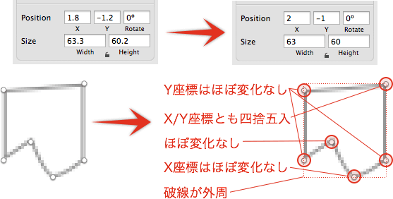 Positionの小数点以下の数値を四捨五入します。サイズも四捨五入されますが、すべてのアンカーポイントではなく、サイズ算出に使う外周のアンカーポイントのみが四捨五入されます。