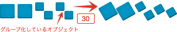 選択しているオブジェクト中で一番下にあるレイヤーを基準に、オブジェクトを入力した数値分の間隔を空けて水平方向に再配置します。オブジェクトを回転している場合は、回転していない状態と見なして再配置されます(角度を0に戻すと入力した値分の間隔が空いている)。垂直方向は変化しません。