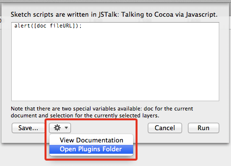 JSTalkを記述するウィンドウが出てくるので、下にある歯車マークをクリックし、「Open Plugins Folder」を選択します。